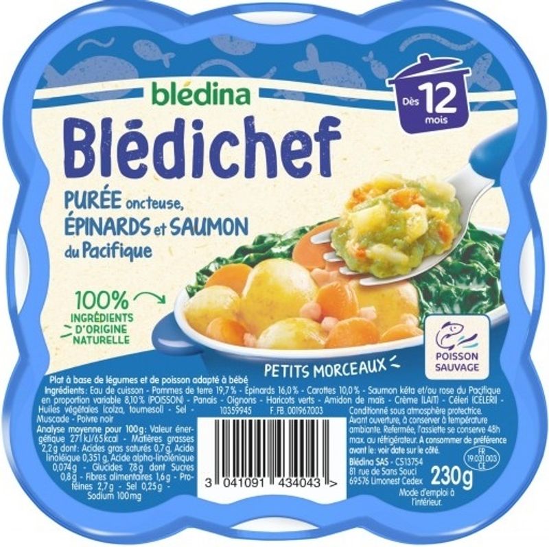 Introduce your little one to the joys of French cuisine with the delectable Spinach and Salmon Puree from Blédina. Expertly crafted for infants aged eight months and older, this tasty blend of spinach, salmon, and a variety of other nutritious ingredients provides a balanced meal for your baby. The premium chum salmon and pink salmon, combined with fresh spinach, carrots, and green beans offer a rich source of vitamins, proteins, and essential Omega-3 fatty acids necessary for your baby's growth and development. The puree is gently cooked and seasoned to perfection, ensuring an appealing taste that will make meal times enjoyable for your young one.