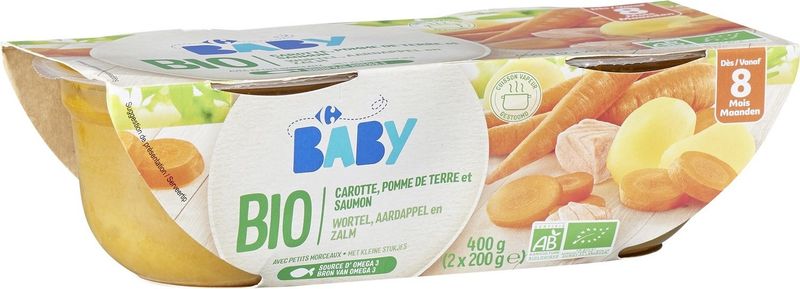 Introducing Carrefour's Organic Carrot, Salmon and Potato for Babies, a carefully crafted meal for your little one. Featuring 35% organic carrots, 22% organic potatoes, and 10.2% organic salmon, this delightful blend is both nutritious and palatable, catering to your baby's growing taste buds and nutritional needs. The product also incorporates organic sweet potato, onion, cassava starch, sunflower oil and rapeseed oil, all carefully chosen for their health benefits. The addition of organic dill adds a hint of flavor, making it a complete meal for your baby.