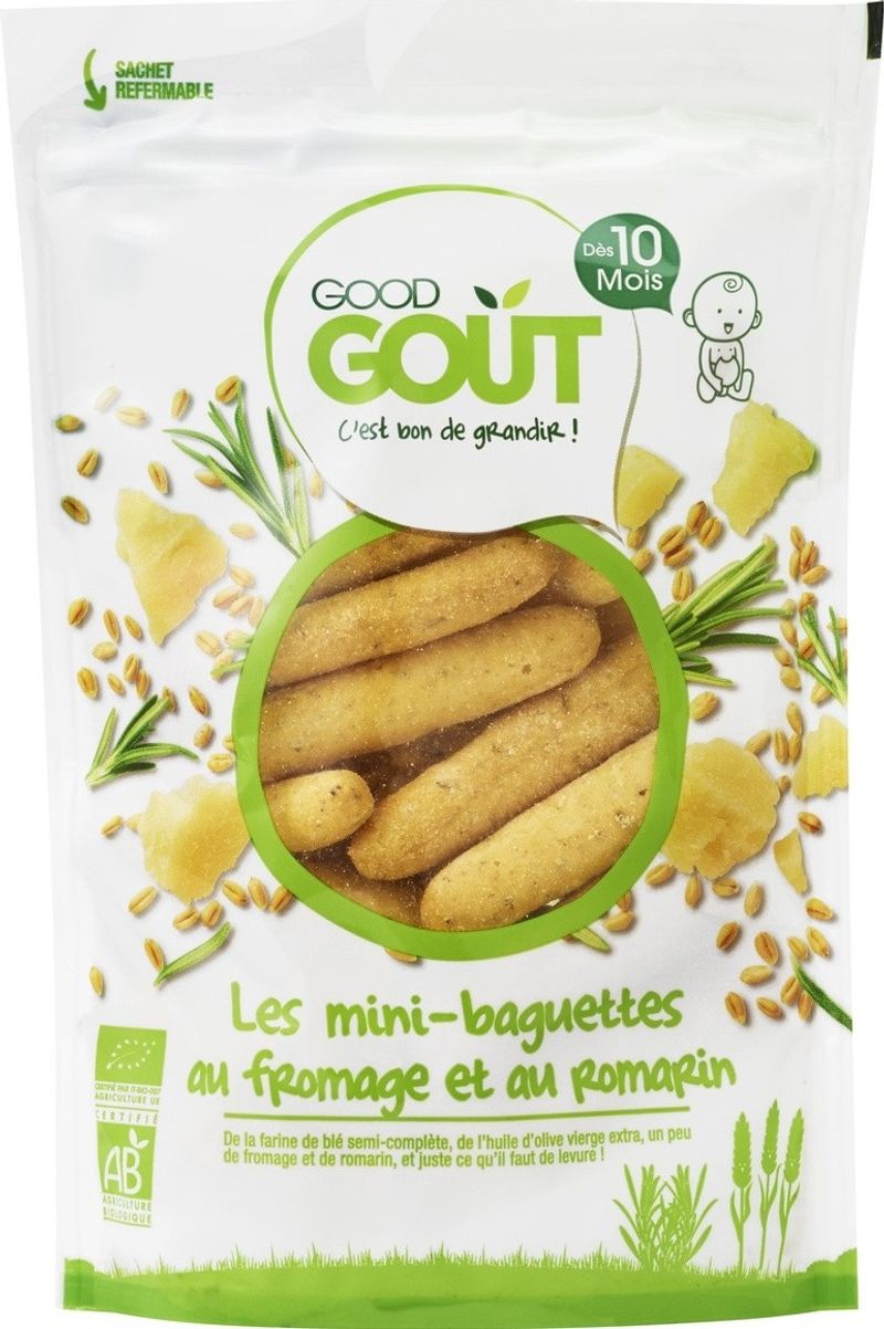 Introducing Good Goût's Mini Baguettes with Cheese and Rosemary, specially created for your little food connoisseur aged 8 months and older. Made with 76.1% semi-complete organic wheat flour, these delightful mini baguettes are a nutritious snack packed with the tanginess of organic cheese and the aromatic hint of rosemary. Enhanced with extra virgin olive oil, the baguettes have a soft, palatable texture that makes them perfect for growing gums and newly sprouted teeth. Every bite is an exploration of taste and texture, promoting your baby's interest and enjoyment for food.