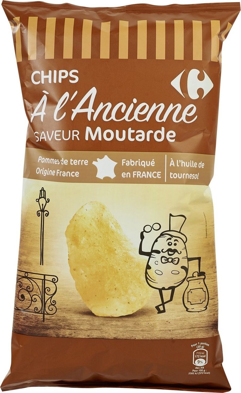 Carrefour's Old-fashioned Mustard Potato Chips are designed to be savored. Ideal for enjoying at any time of the day, they can be served as a tasty snack at parties, family gatherings, or simply when you're feeling peckish at home. Pair them with a crisp beer or your favorite soft drink for a perfect casual culinary experience. Remember to reseal the pack after opening to retain the chips' freshness and delectable crunch.