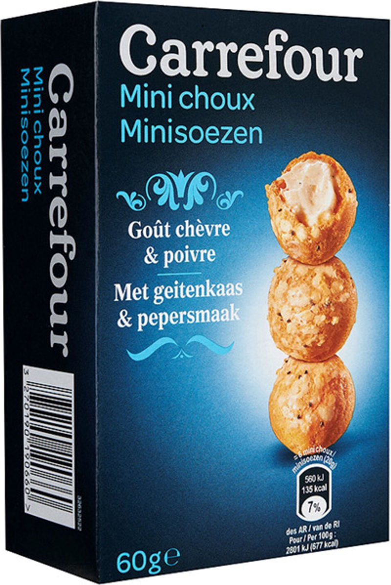 Indulge in the rich and sophisticated flavors of France with Carrefour's Mini Choux Stuffed With Goat Cheese And Pepper. Made with the finest ingredients such as pasteurized whole eggs, coconut oil, wheat flour, and sprinkles of poppy seeds, these snacks deliver a creamy, tangy goat cheese filling with just the right kick of black pepper. The savory choux pastry, traditionally light and airy, is the perfect complement to the robust cheese and pepper filling. This product is a testament to Carrefour's commitment to providing high-quality and delicious aperitif snacks.