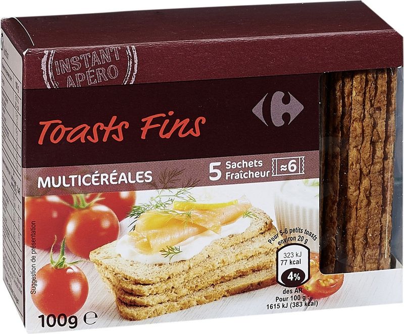 Indulge in the delightful crunch of Carrefour’s Multigrain Fine Toasts - a deliciously healthy addition to your pantry. Made with a wholesome mix of wheat flour, yeast, sesame seeds, oat flakes and bran, rye flakes, millet seeds, soybean grits and more, these toasts are packed with fibre and essential nutrients. The light multigrain texture and subtle flavours make them the perfect choice for all your savoury and sweet toppings. A plus, they are a perfect option for those seeking healthier snack alternatives without compromising on taste or quality.