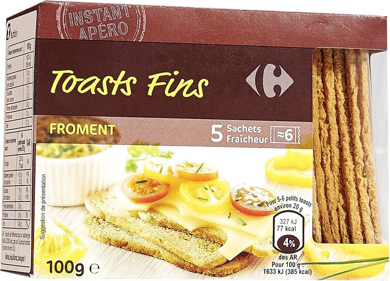 Carrefour's Wheat Fine Toasts are a delectable addition to your aperitif snacks and crackers collection. Crafted from 94% wheat flour, they are delightfully light and crispy. Each piece is enriched with the wholesome taste of barley malt flour and a hint of salt, making them ideal for a variety of spreads and toppings. Emulsifiers such as sodium stearoyl-2-lactylate and soya lecithin enhance their texture, while the addition of ascorbic acid helps preserve their freshness. Note that these fine toasts may contain traces of sesame seeds, milk, and nuts.