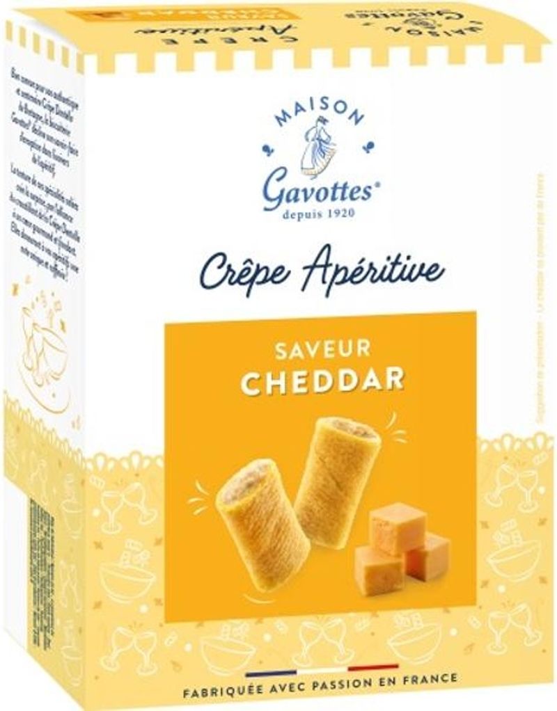 Experience the authentic taste of French snacking with Maison Gavottes' Cheddar Flavour Aperitif Crepes. These savoury delights are the perfect aperitif snack boasting a robust cheddar flavor that's sure to satisfy your taste buds. Crafted from fine quality wheat flour and enriched with cheddar powder, cream powder, and a hint of barley malt extract, each crepe delivers a perfect crunchy bite with a unique fusion of flavors.