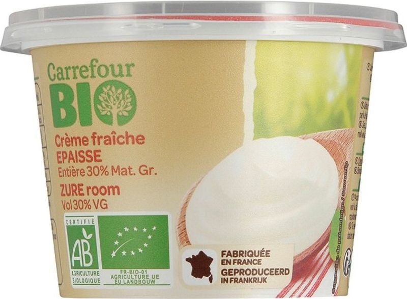 Carrefour's Organic Thick Sour Cream with 30% Fat is a luxurious, velvety dairy product that will elevate any dish. Crafted from organic pasteurized sour cream and lactic fermements, it adheres to the strictest standards in organic farming, guaranteeing you a product free from GMOs, artificial flavors, and preservatives. Perfect for enhancing the richness of your meals or satisfying a craving for a decadent treat, it brings the authentic creamy taste of French dairy to your table.