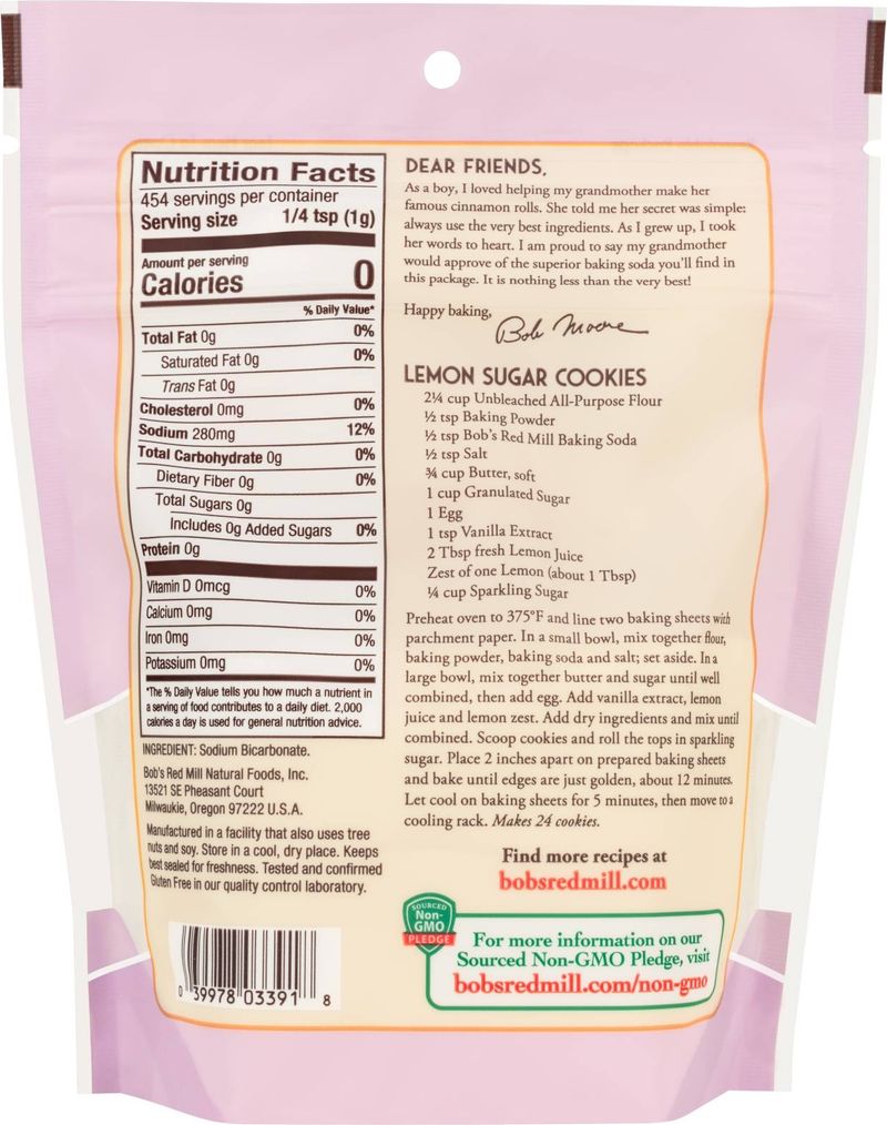 Introducing BAKING SODA 16OZ - a premium and essential ingredient for all your baking needs. Produced by Bob's Red Mill, our double acting baking powder is gluten-free and aluminum-free, resulting in a healthier and tastier end product. Harvested and processed in a dedicated gluten-free facility, we ensure its utmost purity and eliminate the risk of cross-contamination. This baking soda is designed to release carbon dioxide when exposed to moisture and heat, making your dough and batter rise to perfection. Unlike other brands, our baking soda sidesteps metallic aftertastes thanks to a unique blend of monocalcium phosphate and sodium acid pyrophosphate.