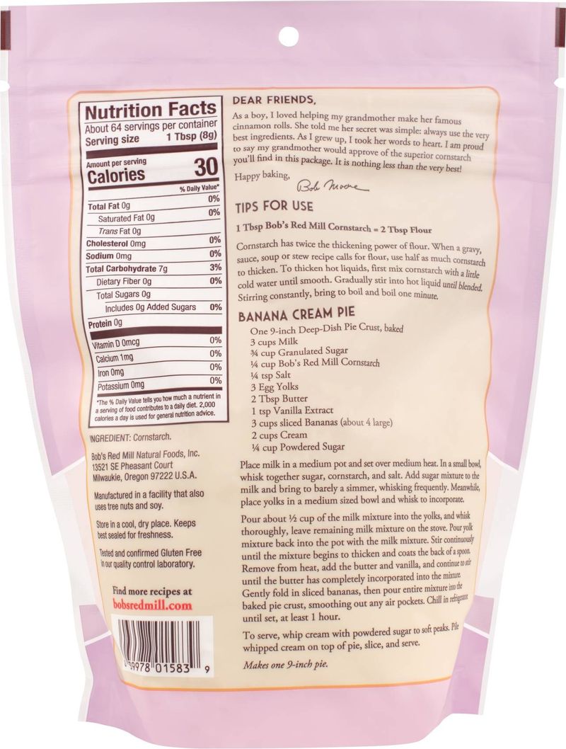 Our CORNSTARCH 18OZ is a premium quality, dense and powdery ingredient made from the endosperm of the corn kernel. It's a fantastic thickening agent, perfect for enhancing the texture of a variety of dishes, from puddings and pie fillings, to sauces, soups, and stews. This cornstarch is also a popular ingredient in many cake and cookie recipes, contributing to a finely textured finish in baked goods. As part of our commitment to health and wellness, our cornstarch is naturally gluten-free and produced in a dedicated gluten-free facility.