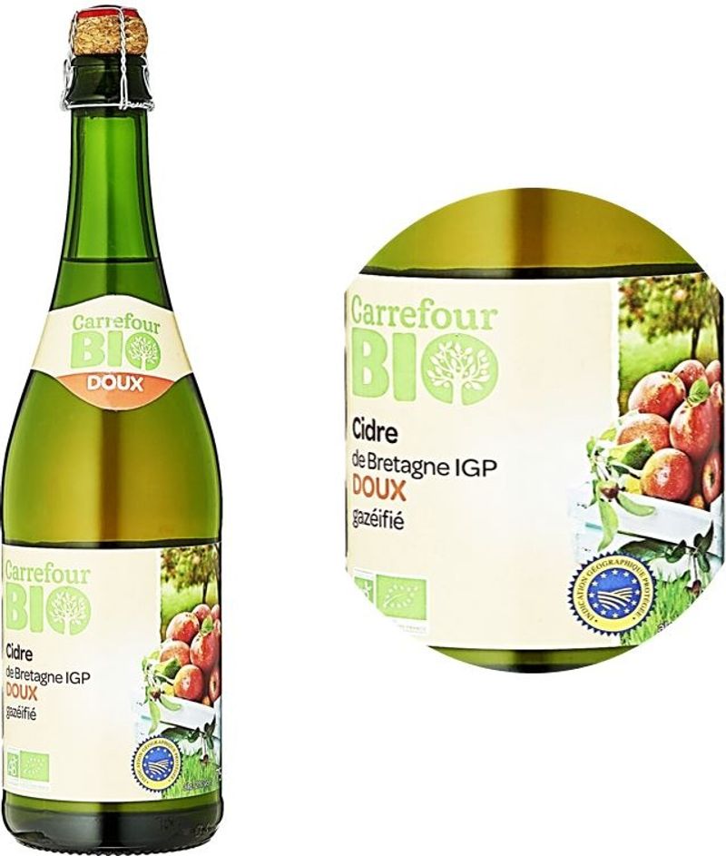 Experience the pure French tradition with Carrefour's Organic Sweet Cider From Brittany PGI. This delightful beverage, a staple of Brittany, is made from organically grown apples, fermented to perfection to achieve a balanced, sweet flavor. Each sip delivers a taste unique to the Brittany region, known for its high-quality ciders. It's not only a drink; it's an experience that takes you on a sensory journey to the heart of France.