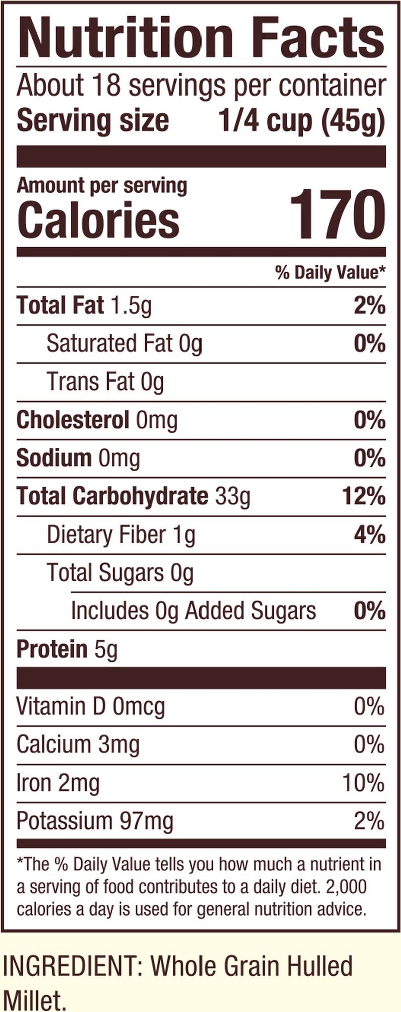 GF MILLET HULLED 28OZ is a high-quality, gluten-free grain sourced from trusted growers. Being hulled, it retains its vital nutrients, boasting a high protein content, fiber, and essential minerals. This versatile grain is not only delicious but also a great dietary addition for those following a gluten-free regimen.