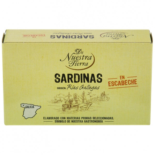 Feast on the flavours of Spain with De Nuestra Tierra's Sardines in Escabeche Sauce. Caught from the Rías Gallegas between May and August using the traditional 'cerco' fishing technique, these sardines are a symbol of our rich culinary heritage. Hand-cleaned and gutted with the utmost care, they are then marinated in a traditional escabeche sauce made from selected premium ingredients - sunflower oil, vinegar, water, salt, and natural flavouring. The end result is a savoury delight that perfectly blends the rich, robust taste of the sardines with the tangy undertones of the escabeche sauce.