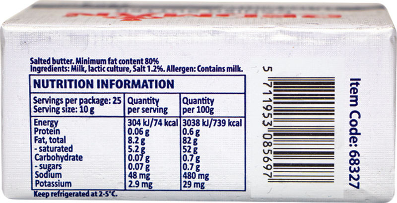 REDMAN Butter Salted 250g is a premium quality butter that's rich, creamy, and tantalizingly tasty. This top-notch butter is lightly salted, enhancing the butter's natural flavor and making it a perfect addition to any dish. Whether you're baking, cooking, or simply spreading it on toast, REDMAN Salted Butter will elevate your culinary experience.