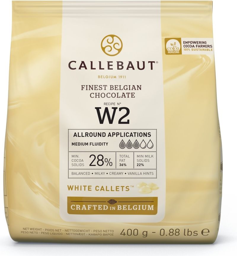 Indulge in the luxurious taste of our WHITE CHOCOLATE COUVERTURE 28% 400G. This exceptional chocolate has a buttery sweetness that melts smoothly in your mouth, providing an opulent experience in every bite. Made from the finest ingredients, it promises a high-quality dessert ingredient that will impress every chocolate lover.