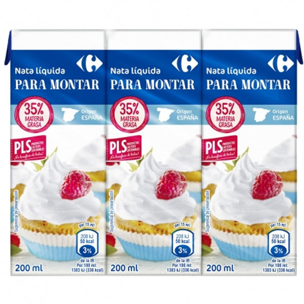 Indulge in the creamy goodness of our Nata líquida para montar, otherwise known as Whipping Cream from Carrefour España. This versatile ingredient is a staple in every discerning cook's pantry. With a minimum fat content of 35.1%, it ensures a rich, smooth texture in your culinary creations, making it perfect for both savoury and sweet dishes. Our whipping cream is stabilized with cellulose, cellulose gum, and carrageenan, which ensure its longevity and allow it to whip up beautifully every time.