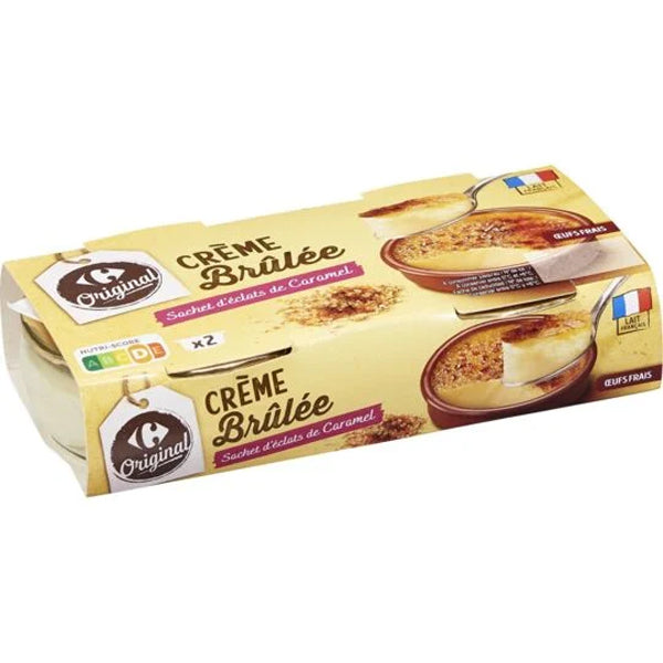 Savor the rich, gourmet flavor of Carrefour's Crème Brûlée. This quintessential French dessert is made with the freshest dairy ingredients sourced right from France, promising a delightful culinary experience. Each package contains a delectable blend of 58% cream, 12.5% fresh eggs, sugar, skimmed milk, and 7.5% fresh egg yolk along with the unmistakable essence of vanilla flavoring. The addition of a bag of caramel chips gives it an extra touch of indulgence and authenticity, making it the perfect treat for a sweet tooth or a special occasion.
