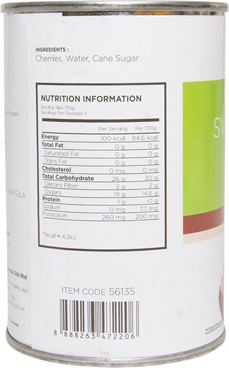 Made in USA, our Pitted Dark Sweet Cherries are a deep, dark shade of red and have a soft bite. This product is soaked in cane sugar syrup, and is available in cans of 440g and 3090g.How to use Sweet and slightly tart, these cherries are the perfect balance for pies, crumbles, danishes, galettes, ice-creams and cheesecakes.Suggested RecipesRecipe suggestions include Dark Cherry Buttermilk Pancakes, Crispy Deep Fried Cherry Pie and Cherry Galette.IngredientCherries, Water, Cane SugarAllergen