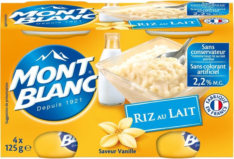 Indulge in the rich, creamy goodness of Mont Blanc's Vanilla Rice Pudding. Made with a high percentage of wholesome milk products sourced from France, this delectable dessert promises a velvety texture with every bite. The tantalizing aroma of vanilla adds a delightful twist to this classic treat, while the chewy rice grains bring an irresistible mouthfeel. With no artificial flavors, this pudding embodies genuine sweetness, enhanced by a touch of sugar and enriched by a hint of corn starch and salt. Please note that this product contains milk and may carry traces of nuts and almonds.