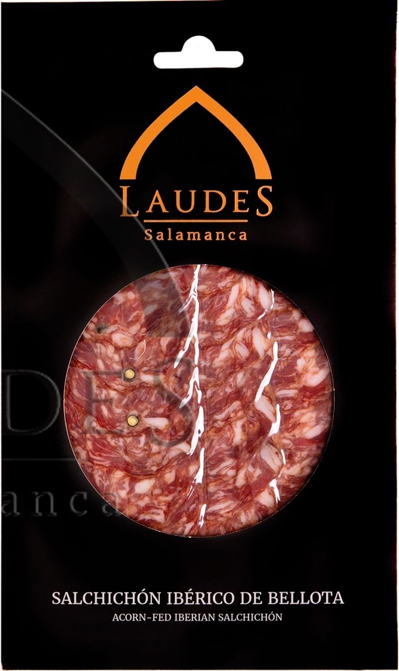 Introducing the Laudes Sliced Iberian Acorn-Fed Sausage - a gastronomic delight from the heart of Spain. This Salchichón Ibérico de Bellota, perfectly sliced and ready to eat, offers a unique flavor profile that elevates any meal. Fed exclusively on acorns, the Iberian pigs produce a meat that’s both rich and delicately flavored, with a wonderful balance of savory and sweet notes. The Laudes brand is renowned for their commitment to quality and tradition, ensuring every slice of this sausage encapsulates the true essence of Spanish cuisine.