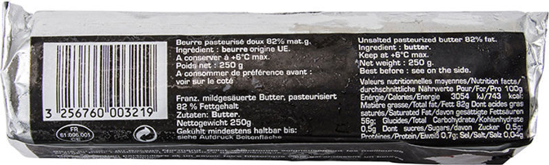 Butter 100 % : Cream 99.99 %, Origin: France, Lactic Ferments 0.01 %. Allergenes: Contain: Milk, Lactose.