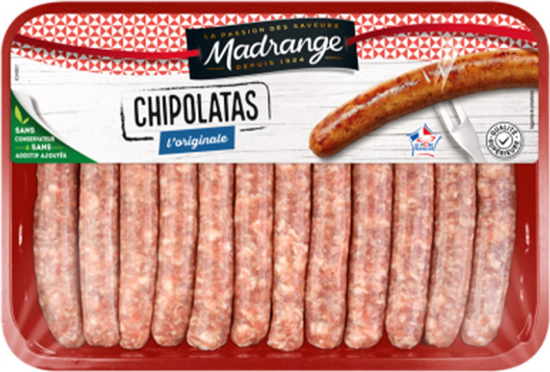 Savor the delectable taste of France with Madrange's Chipolata. This premium frozen deli meat, made with 91% pork, boasts an enticing blend of spices, natural flavorings, and a hint of red beetroot and acerola extract. True to traditional French charcuterie, each chipolata is encased in natural sheep’s casing, rendering a burst of flavors with each bite. The addition of sea salt and a hint of cider vinegar extract enhances the taste, making it an irresistible choice for meat lovers who appreciate quality and taste in every bite.