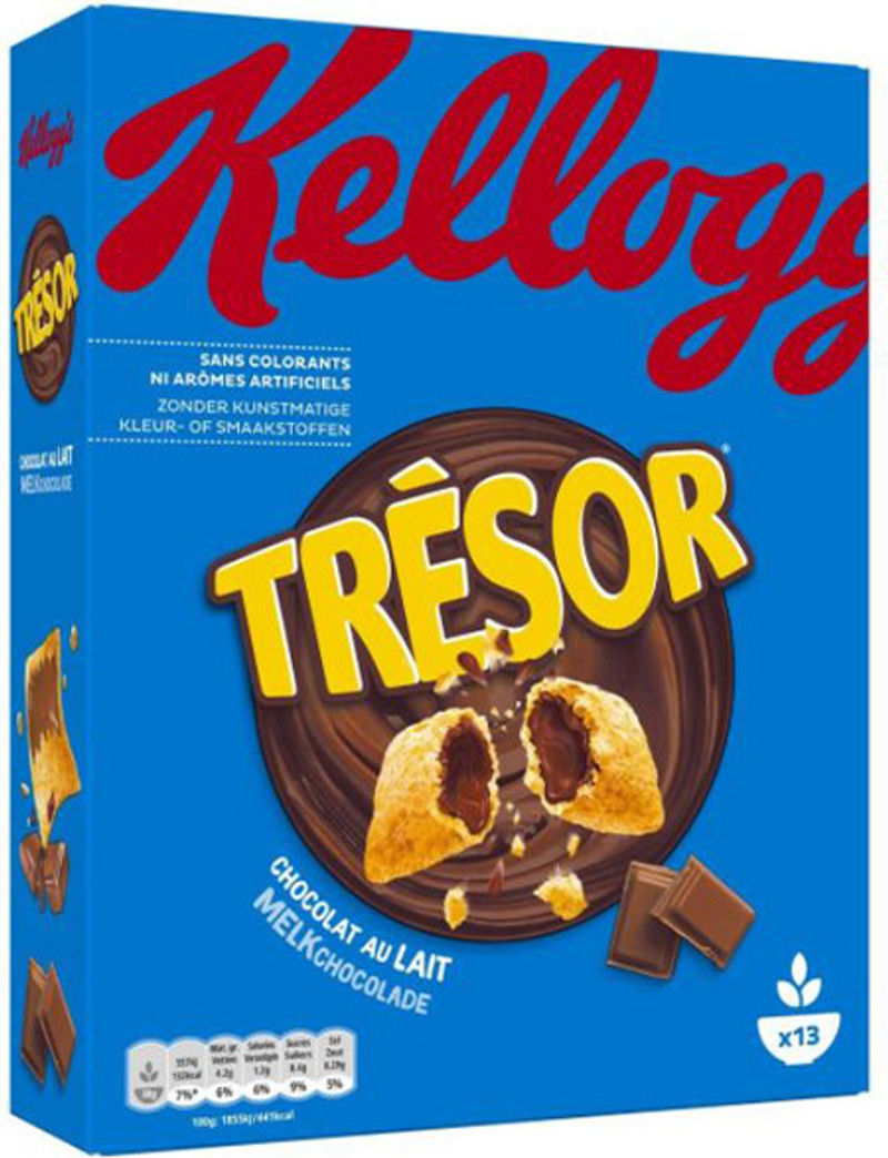Experience the delightful burst of milk chocolate with each bite of Kellogg's Tresor Milk Chocolate Filled Cereals. Made with a generous 55% of cereal flours including wheat and corn, these cereals offer a wholesome start to your day. The rich milk chocolate filling, complemented with a blend of high-quality vegetable oils and a dusting of low-fat cocoa powder, brings a luxurious taste that will have you looking forward to breakfast. The cereals are fortified with essential vitamins and minerals such as Niacin, B Vitamins, Folic acid and Iron, making them not just delicious, but nutritious too.