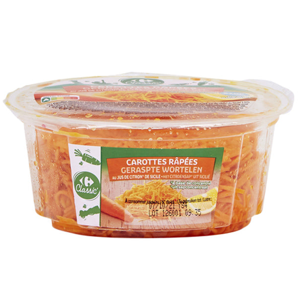 Experience the refreshing tang of Carrefour's Grated Carrots With Lemon Juice. This deli-favorite is made with 80% carrots, finely grated to create a delightfully crunchy texture. The carrots are then marinated in a special blend of rapeseed oil, MOUTARDE, vinegar, sugar, and select spices, before being finished with a splash of concentrated lemon juice for that zesty kick. This product is carefully crafted to ensure maximum freshness and flavor, with every bite offering a delicious carrot crunch with a citrusy aftertaste. The addition of xanthan gum as a stabilizer ensures a consistent texture, and the preservative potassium sorbate maintains its quality. Please note that it may contain traces of CELERI.