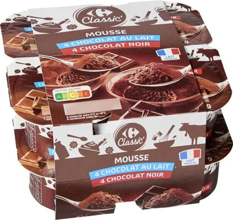 Indulge your senses with Carrefour's Dark and Milk Chocolate Mousse. A decadent French dessert, this mousse is a creamy delight made from rich dark chocolate and smooth milk chocolate. Each spoonful is a tantalizing blend of premium cocoa, cream, and skim milk, promising an authentic chocolaty taste. This exquisite dessert is part of Carrefour's dairy collection, made with the highest quality ingredients, ensuring a delectable treat that satisfies every chocolate craving. With 63.1% skim milk in the dark chocolate and 63.6% in the milk chocolate dessert, it is lower in fat and calories, making it a guilt-free pleasure for all chocolate lovers.