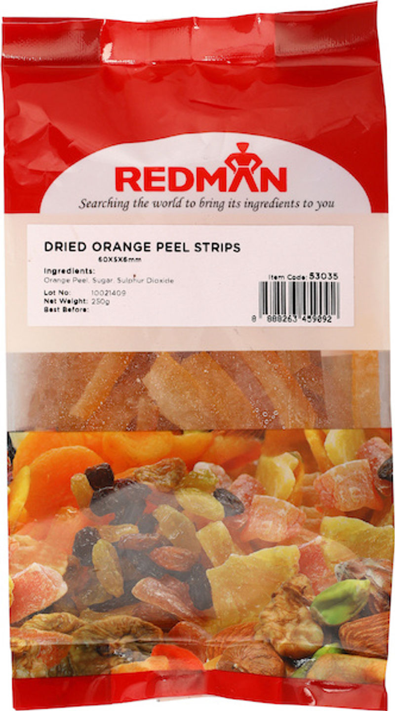 Discover the fragrant delight of our Redman Dried Orange Peel Strips, expertly crafted in the Netherlands. These specially prepared strips offer a robust and fresh citrus fragrance, sure to invigorate your senses with every use. The peel is the most aromatic part of the fruit and is beautifully captured in this product. Sweetened and ready to use, they come in handy 250g and 1kg packets.