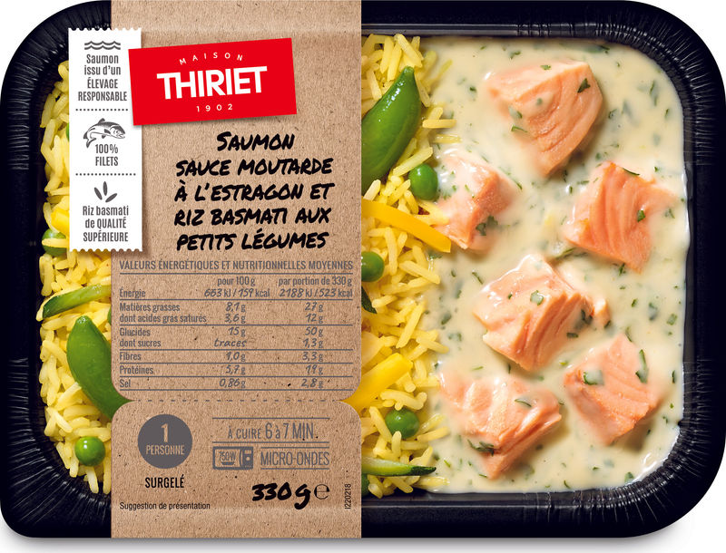 Savor the exquisite taste of the Maison Thiriet's delicately prepared frozen meal, Salmon with Tarragon Mustard Sauce and Basmati Rice. This sumptuous fare is a superior blend of Atlantic salmon smothered in a tangy tarragon mustard sauce, served with aromatic basmati rice. Each bite is a celebration of flavors, with the rich creaminess of the sauce, tender salmon, and the unique taste of basmati rice. The addition of yellow carrots, peas, and courgette gives this ready-to-eat meal an exciting crunch and an extra burst of nutrients. Made with the highest quality ingredients, this frozen meal brings gourmet dining right to your home, with the added convenience of quick and easy meal prep.