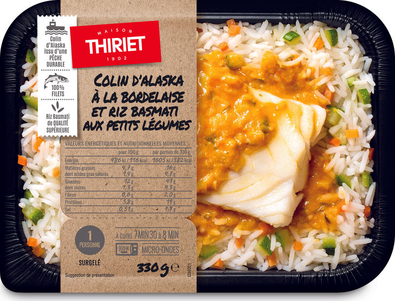 Indulge in a wonderfully crafted French culinary delight with Maison Thiriet's Alaska Coley, Bordelaise Sauce, Basmati Rice. This frozen ready-to-eat meal consists of tender Alaskan Coley fillets, cooked basmati rice, and a blend of fresh vegetables like onions, zucchini, shallots, and carrots, all in a rich Bordelaise sauce. The sour cream and the hint of lemon, along with the perfect balance of parsley, and black pepper, are sure to tantalize your taste buds. This meal makes for a quick yet satisfying dinner option on busy weekdays, or when you desire a delicious restaurant-quality meal at home.