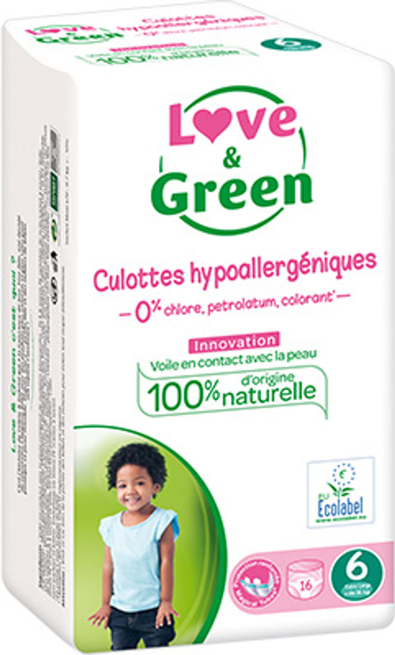 Love & Green's Hypoallergenic and Ecolabellised Pull Up Pants T6 (+16kg) are the perfect choice for your little one's sensitive skin. Lovingly made from 100% cellulose certified fsc from responsible forests and tcf non-chlorine bleach, these pull-up pants provide super absorbency without causing any irritation. The skin-in-contact veil is made from biobased materials such as PLA and green PE derived from cornstarch and cane sugar, ensuring that your baby's skin stays soft and comfortable throughout the day. The outer shell is crafted from natural corn starch and a non-woven veneer of natural origin, offering a gentle and snug fit.