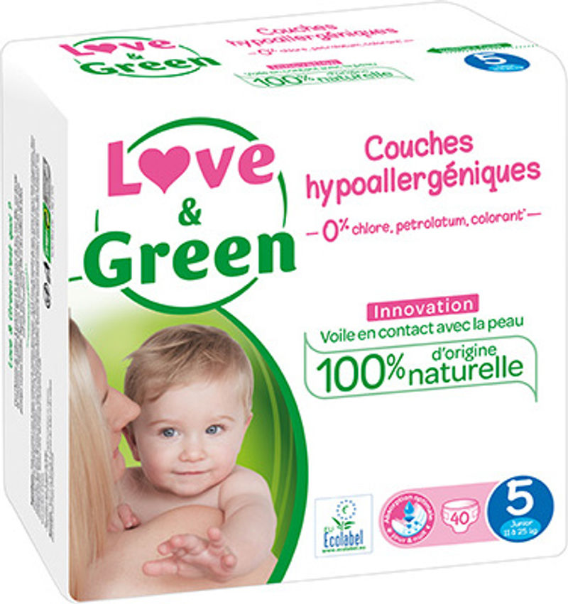 Introducing Love & Green's Hypoallergenic And Ecolabellised Nappies T5, designed specifically for babies in the weight range of 11 to 25kg. These nappies are crafted from 100% FSC certified cellulose from responsibly managed forests and feature an absorbent cushion of copolymer microbeads. With a skin-contact veil made from biobased materials, they are great for your baby's delicate skin and for the environment too. The eco-label signifies our commitment to sustainability, and the nappies are free from chlorine, colorants, petrolatum, and paraffin, ensuring they are as natural and pure as possible. Dermatologically controlled, they are also hypoallergenic providing gentle care for your little one's skin.
