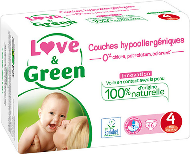 Presenting Love & Green's Hypoallergenic and Ecolabel-certified Nappies T4, suitable for babies weighing between 7 to 14kg. These nappies are designed with your baby's comfort in mind, providing soft and secure cushioning created from 100% cellulose certified from responsibly managed forests and non-chlorine bleached. The nappies feature absorbent microbeads of copolymers for high efficiency and the skin-contact layer is made from biobased materials like PLA & Green PE derived from cornstarch and sugarcane. What sets these nappies apart is their eco-conscious design, created with elements like natural corn starch outer shell, non-woven veneer of certified natural origin, and hydrophobic spandex for elasticity.