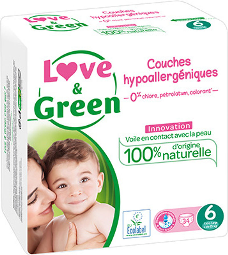 Offer your little one the perfect blend of comfort and care with Love & Green's Hypoallergenic and Ecolabellised Nappies T6 (+15kg). These eco-friendly and hypoallergenic nappies boast a design that caters to sensitive skin while prioritizing sustainability. The cushion is made from 100% cellulose certified by the Forest Stewardship Council and TCF (non-chlorine bleached), ensuring responsible sourcing. The absorbent microbeads of copolymers provide superior absorption, while the skin-contact veil made from biobased materials like PLA & Green PE (cornstarch/sugar cane) provides a gentle touch.