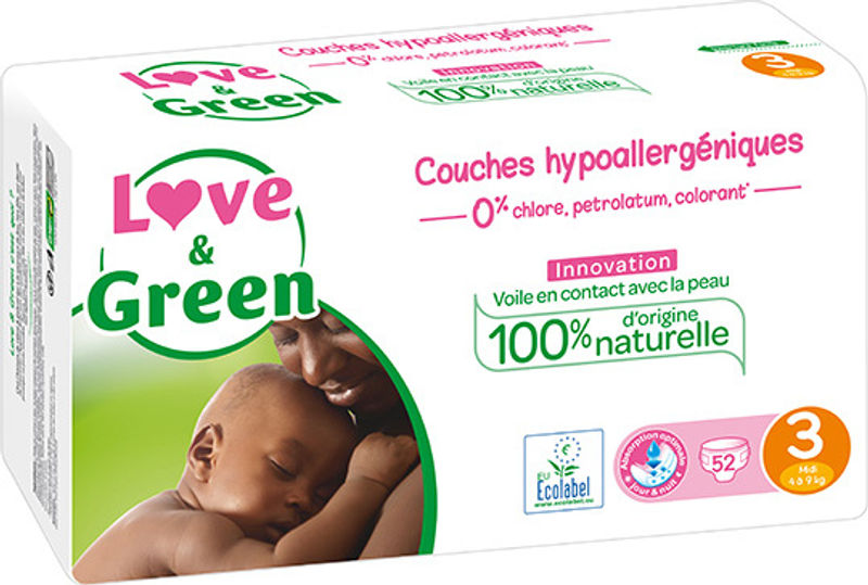 Care for your baby's comfort and the environment with Love & Green's Hypoallergenic And Ecolabellised Nappies T3 (4 To 9kg). Crafted with natural and biobased materials, including FSC-certified cellulose from responsible forests and non-chlorine bleached, these nappies are designed with your baby's sensitive skin in mind. These hypoallergenic nappies feature a skin-in-contact veil made of biobased materials, PLA & green PE (cornstarch/sugar cane), offering a gentle touch. The outer shell is made from natural corn starch and a non-woven veneer of FSC certified natural origin. With their velcro fastening and elasticity, they provide a snug, leak-proof fit, ensuring maximum comfort and protection for your little one.