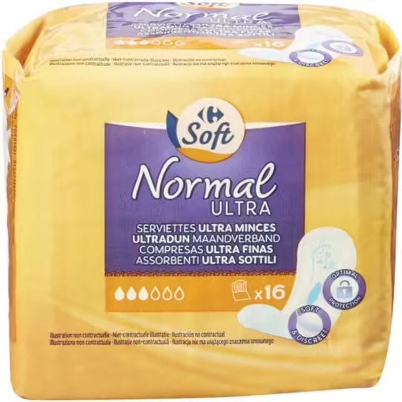 Stay comfortable and protected during your periods with Carrefour's Ultra-Thin Normal Sanitary Pads. Made with luxurious non-woven polypropylene, these sanitary pads offer a soft and comfortable wear. The pads feature superabsorbent sodium polyacrylate and cellulose fibres that provide excellent fluid retention. Synthetic polyethylene fibres and thermoplastic polymer adhesives ensure a secure fit and reliable leak protection. Decorative inks add a touch of style to this essential feminine care product.