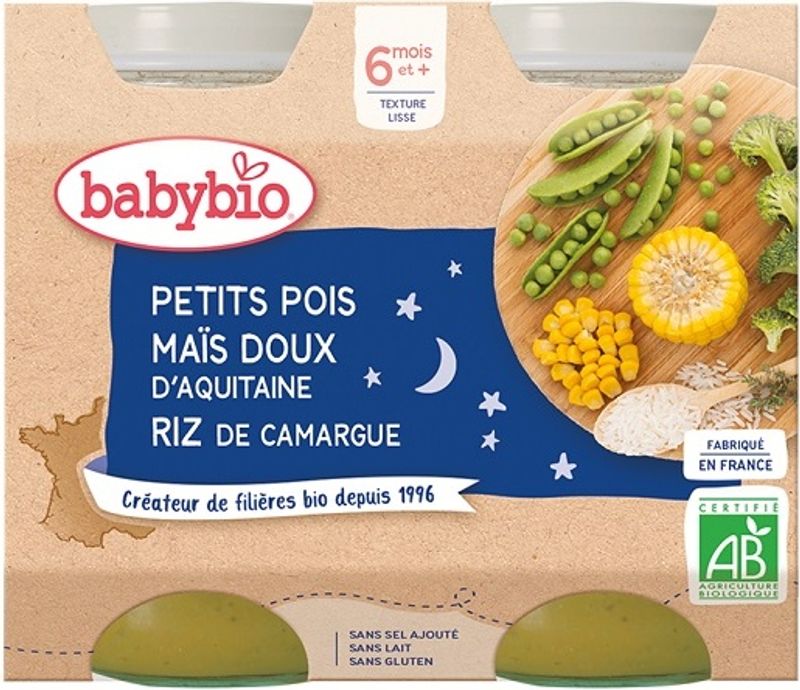 Introduce your little one to the delicious and nutritious world of organic food with Babybio's Organic Sweet Pea and Aquitaine Corn Rice. Specially crafted for babies from 6 months onwards, this delightful meal combines the sweetness of Spanish peas and Aquitaine sweet corn with the gentle crunch of Camargue rice. Enhanced with the subtle touch of thyme and the goodness of Spanish broccoli and French onions, this dish is a delightful journey of tastes for your baby's developing palate. All ingredients are sourced from organic farming, ensuring your baby gets the most wholesome and natural nutrition.
