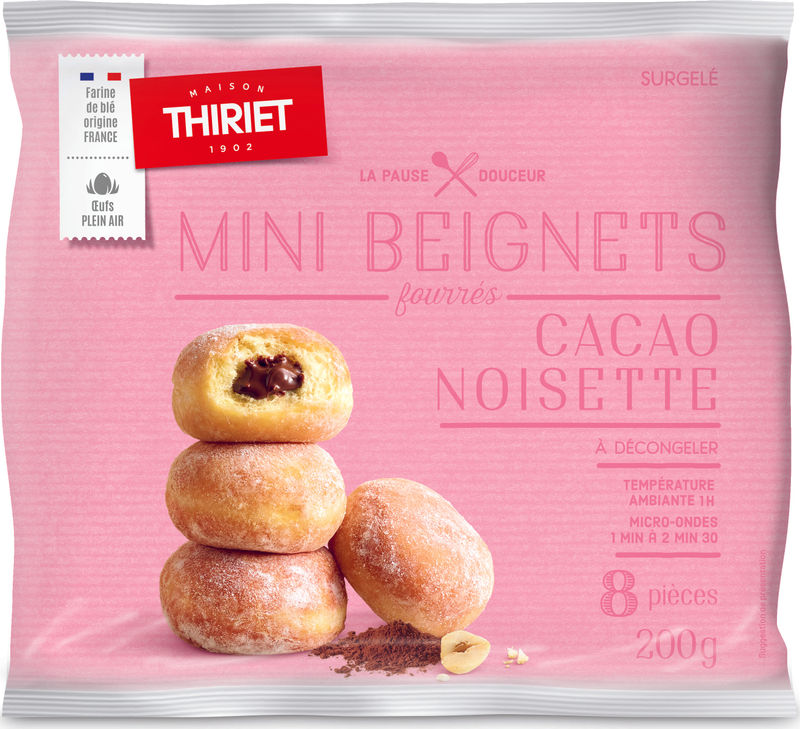 Indulge in the sweet delight of Maison Thiriet's 8 Mini Doughnuts Filled With Cocoa And Hazelnut. Crafted in the heart of France, these mini doughnuts are a delightful harmony of velvety cocoa and rich hazelnut surrounded by a fluffy, golden dough. The ingredients boast a high quantity of French origin wheat flour, adding to the authentic taste, with a hint of low-fat cocoa powder and hazelnut paste to create a truly irresistible dessert. Maison Thiriet uses only top-quality ingredients, including pure butter, fresh eggs, and a blend of vegetable oils, ensuring a dessert that is rich in taste and texture. Perfect for a weekday treat, or to impress at a weekend gathering, these mini doughnuts are a taste of luxury that's conveniently frozen for freshness.