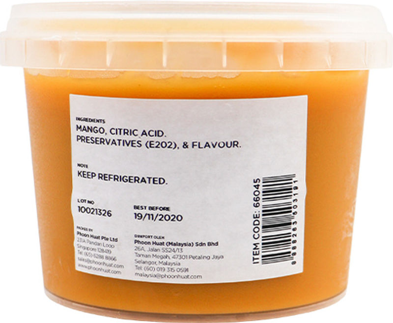 Dive into the tropical taste of our Redman Mango Puree. Made in Singapore, this unsweetened blend allows for controlled sugar levels, making it a healthier option for those who want to maintain a balanced diet. The puree is packed with the succulent flavor of ripe mangoes, a hint of citric acid, and other ingredients, ensuring a burst of freshness with every spoonful.