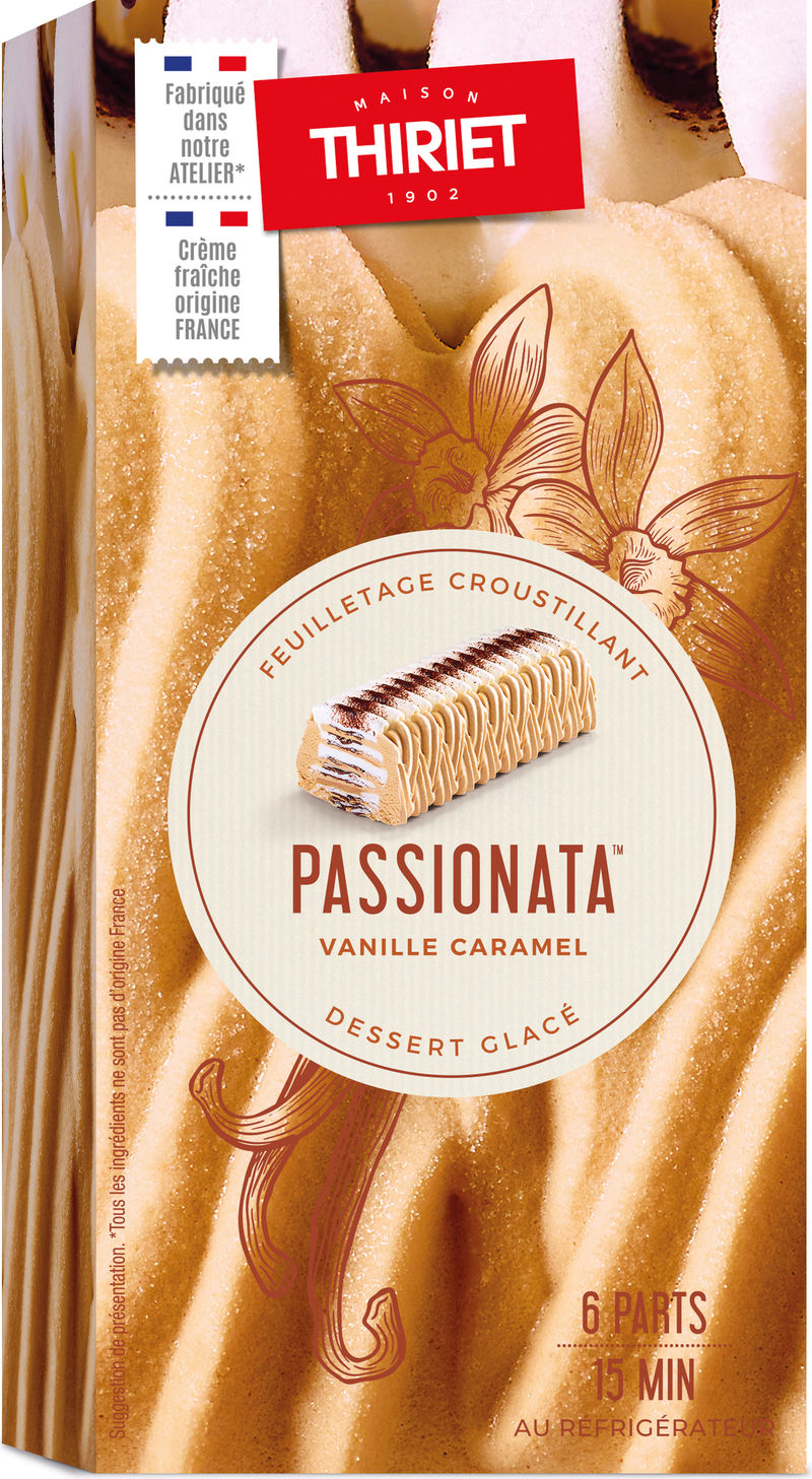 Indulge in the supreme pleasure of Maison Thiriet's Passionata Vanilla Caramel. This frozen dessert is a delectable blend of velvety vanilla flavour, harmoniously combined with indulgent sour cream caramel. Each bite is a gourmet experience that will transport you to the heart of France, embodying the mastery of French dessert making. The high-quality ingredients include rehydrated skimmed milk powder, sour cream, and an exciting hint of cocoa, making it the perfect delight for those with a sweet tooth.