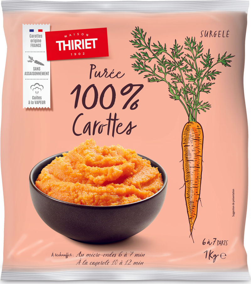 Indulge in the authentic taste of France with Maison Thiriet's Carrot Purée. This nutritious and flavorful frozen dish is made using steamed carrots sourced directly from French farms, ensuring you get the best of quality and taste. Each spoonful of this delightful purée promises a creamy, comforting and wholesome eating experience that not only satisfies your tastebuds but also contributes to your daily vegetable intake. Ideal for those seeking healthy yet convenient food options, this frozen purée is a fantastic addition to your freezer essentials.