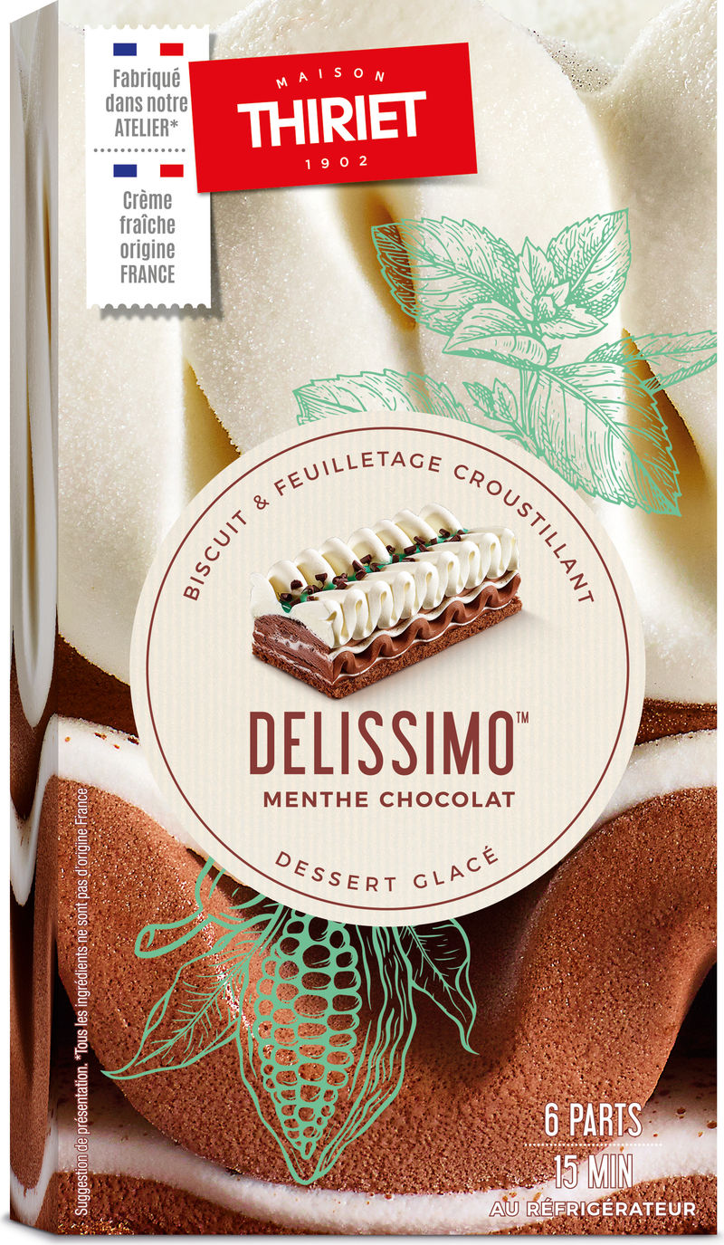 Introducing Delissimo Mint Chocolate from the house of Maison Thiriet, a delightful frozen dessert made from choice high-quality ingredients. Each bite is a perfect blend of rehydrated skimmed milk, fresh cream, and a dash of dark chocolate, all sourced from France. A hint of natural mint and vanilla flavors masterfully elevate the taste, while the almond powder and cocoa mass provide a satisfying, rich texture. This frozen delicacy, filled with wholesome goodness and a mesmerizing chocolate-mint duo, is certain to make your taste buds dance.
