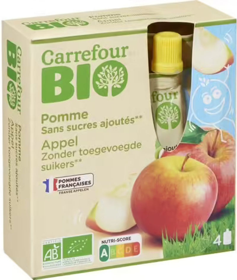 Indulge in the natural and pure flavors of Carrefour's Organic Apple Sauce In Gourds, with No Added Sugar. Made from 99.9% organic apple puree and a hint of lemon juice concentrate, this apple sauce offers an authentic and refreshing taste of ripe, crisp apples in every bite. Produced from organic farming, this delicate fruit compote is not only delicious but also a healthy snack choice. Perfect for those seeking a sweet treat without the guilt, its natural sweetness comes solely from the ripe fruit used, making it free from added sugars.