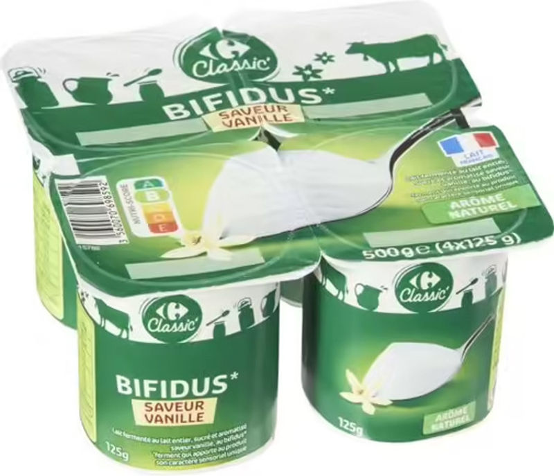 Indulge in the velvety-rich Carrefour Bifidus Yoghurt Vanilla Flavor. Made from 88% whole milk sourced locally from France, this yoghurt is a delightful treat for your palate and a beneficial addition to your diet. It's infused with a hint of natural vanilla for a flavor that's refreshing and comforting all at once. This yoghurt also contains 8.4% sugar and skimmed milk powder, all from French sources, ensuring a high-quality product. Fortified with lactic ferments, including bifidobacterium, this yoghurt aids in digestion and overall gut health.