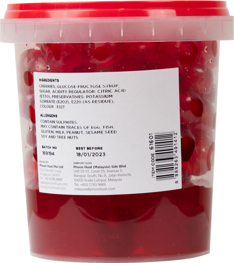 Delight in the taste of our Whole Red Glaced Cherry, a product of rich Italian tradition. These cherries are perfectly preserved in a concoction of glucose-fructose syrup and a touch of citric acid for a tasty, sweet and tangy burst of flavor. Enhanced with a hint of color E127, they add a vibrant touch to your culinary creations. Perfect for decorating baked goods or as a candied fruit in your favorite recipes. Please note, these cherries contain preservatives potassium sorbate and E220 as residue.