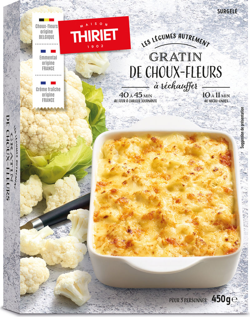 Indulge in the rich, creamy goodness of Maison Thiriet's Cauliflower Gratin. This comforting French classic is made with 49.5% cauliflower florets, smothered in a savory mixture of whole milk, Emmental cheese, and a touch of sour cream. The dish is then topped with a light dusting of wheat flour and a sprinkling of salt to enhance its flavors. Perfectly frozen to lock in its freshness, this ready-to-eat meal is a convenient option for those days when you desire a hearty, home-cooked meal but are pressed for time.
