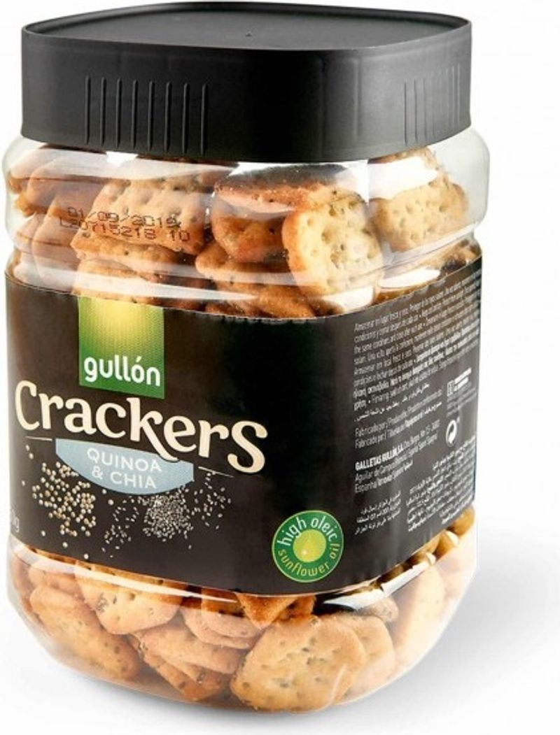 CHIA & QUINOA CRACKERS 250G is a delectable and healthy snack originating from the heart of Spain. Crafted with carefully sourced wheat flour, chia seeds, flax seeds, and quinoa seeds, these crackers are subtly flavored with hints of garlic powder and dried oregano. Enriched with the goodness of high oleic sunflower vegetable oil and oligofructose, each bite of this nutritious treat packs a crunchy punch. A touch of malt syrup and sugar adds a sweet undertone, making it a perfect choice for health-conscious foodies.