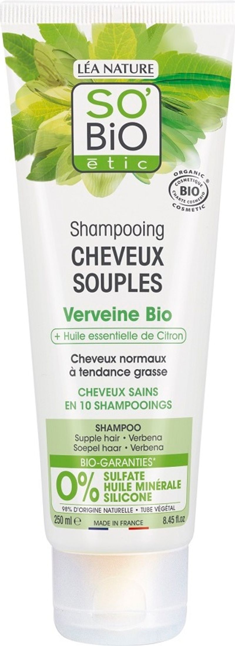 Experience the revitalizing power of nature with the Organic Verbena Supple Hair Shampoo from So’Bio Etic. This gentle, yet effective shampoo is formulated using a combination of organic verbena leaf water, aloe leaf juice powder, and lemon peel oil, making it a potent blend for nourishing your hair. Its sulfate-free formula ensures an ultra-soft cleanse, preserving the natural balance of your scalp and leaving your hair supple, shiny, and easy to style. This product is housed in eco-friendly vegetal plastic containers, showing So’Bio Etic's commitment to sustainable practices.