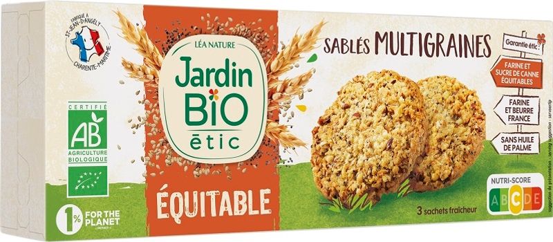 Indulge in a delicious and nutritious treat with our Jardin Bio Organic Multi-cereals Biscuits. Made with a blend of organic wheat flour, rye flakes, flax seeds, pvaot seeds, and toasted sesame seeds, these biscuits offer a delightful crunch in every bite. A touch of cane sugar and a splash of butter give these biscuits a sweet yet wholesome taste. Perfect for those who enjoy a healthy snack, each biscuit is also made with organic puffed rice for added texture. The delightful mix of ingredients is not only rich in fiber but also complies with fair trade standards. Please note that these biscuits may contain traces of lupin, eggs, soya, and nuts.
