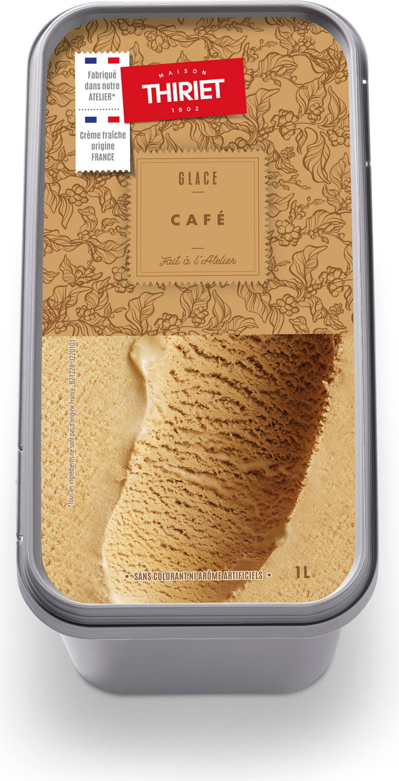 Indulge in the decadent taste of Maison Thiriet's Coffee Ice Cream. This exquisite dessert is a blend of rehydrated skimmed milk powder, sour cream, and a generous 5.2% of coffee extract and freeze-dried coffee. The rich, creamy texture is balanced with a robust coffee flavor, creating an indulgent treat that coffee enthusiasts will love. Each spoonful is a delightful explosion of taste, further enhanced by the additions of coconut oil, glucose syrup, and a hint of sugar. This product is kept frozen to ensure it retains its rich, creamy texture and delicious flavor for you to enjoy at any time.