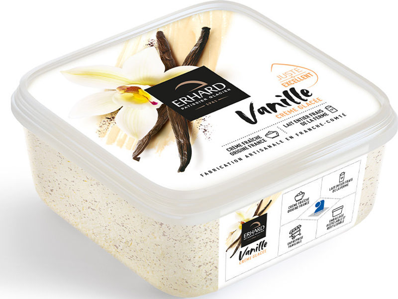 Experience the indulgent taste of Erhard Vanilla Ice Cream crafted with the finest French ingredients. Our vanilla ice cream is a creamy delight made with 39% pasteurized whole farm milk and 32% fresh pasteurized cream. It's infused with real vanilla extract and specks of vanilla bean powder, offering a sweet and aromatic flavour that’s sure to uplift your mood. Thanks to our use of high-quality ingredients like free-range egg yolk, dehydrated glucose syrup, and skimmed milk powder, every spoonful is a testament to Erhard's dedication to exceptional taste and quality. Please note, this product may contain traces of nuts, soy, horses, and sesame.